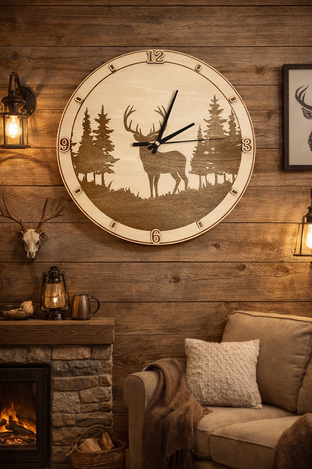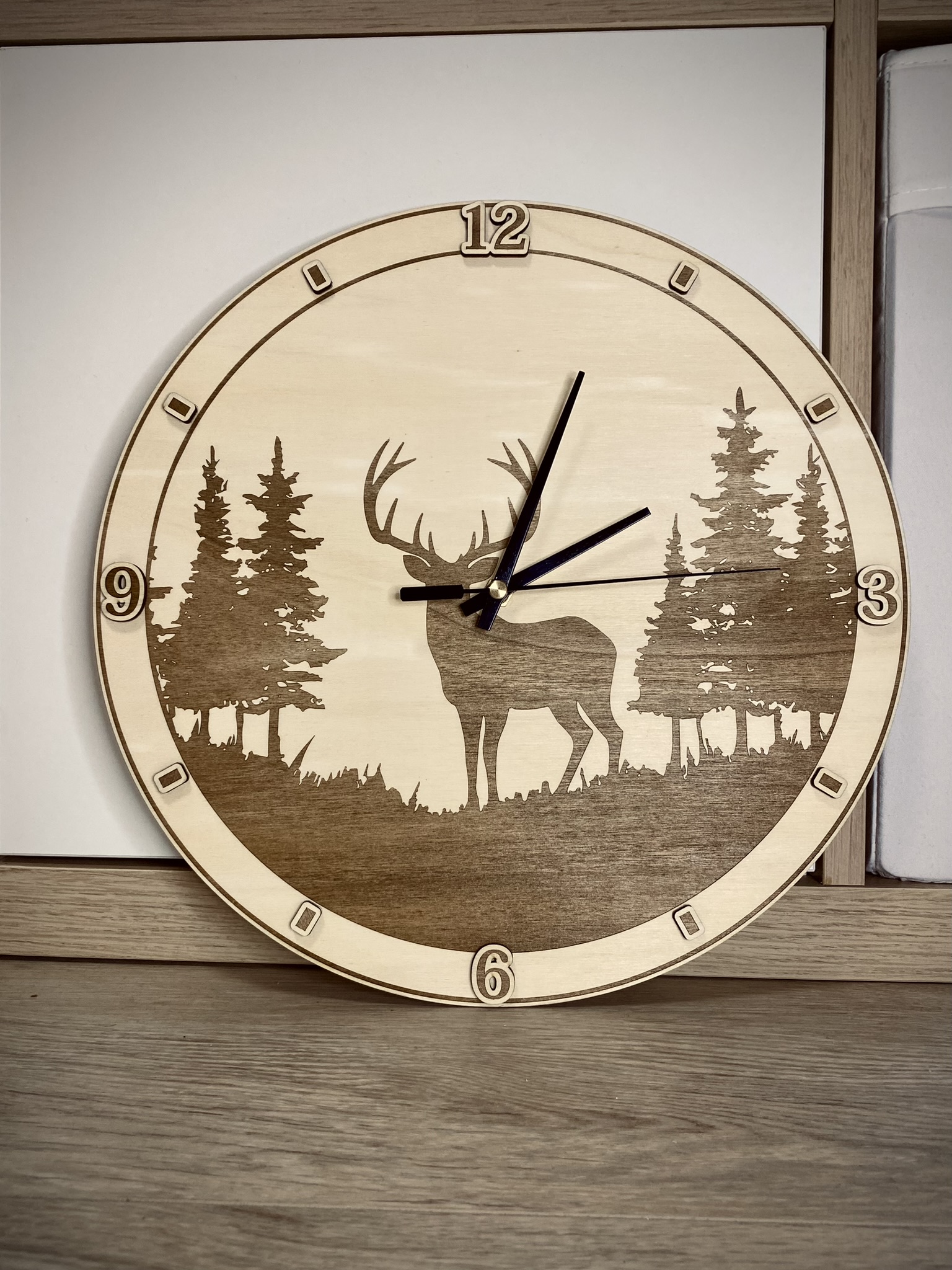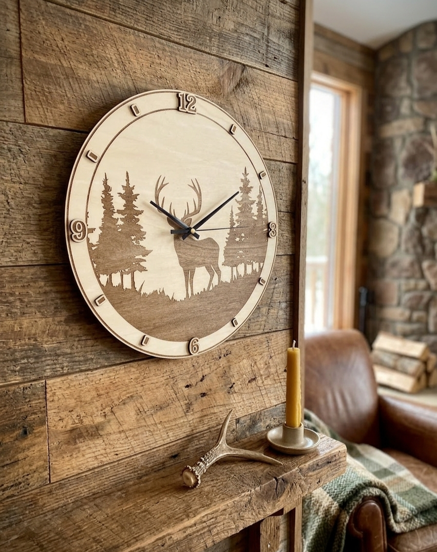 Hozd be a természet nyugalmát az otthonodba ezzel az egyedi, gravírozott fa faliórával! A részletgazdag szarvas és erdei táj motívum tökéletes választás azok számára, akik szeretik a rusztikus, meleg hangulatú dekorációkat.