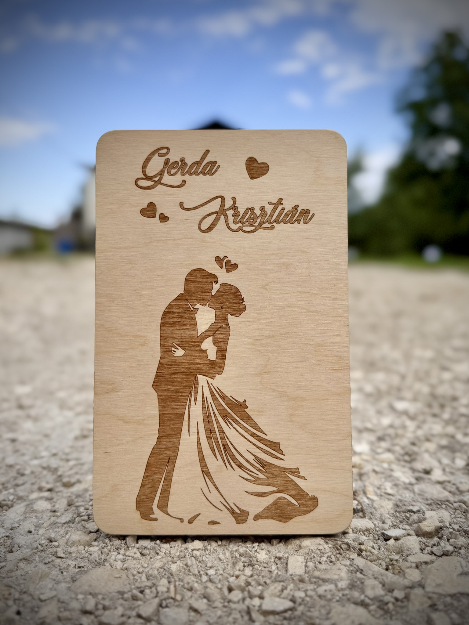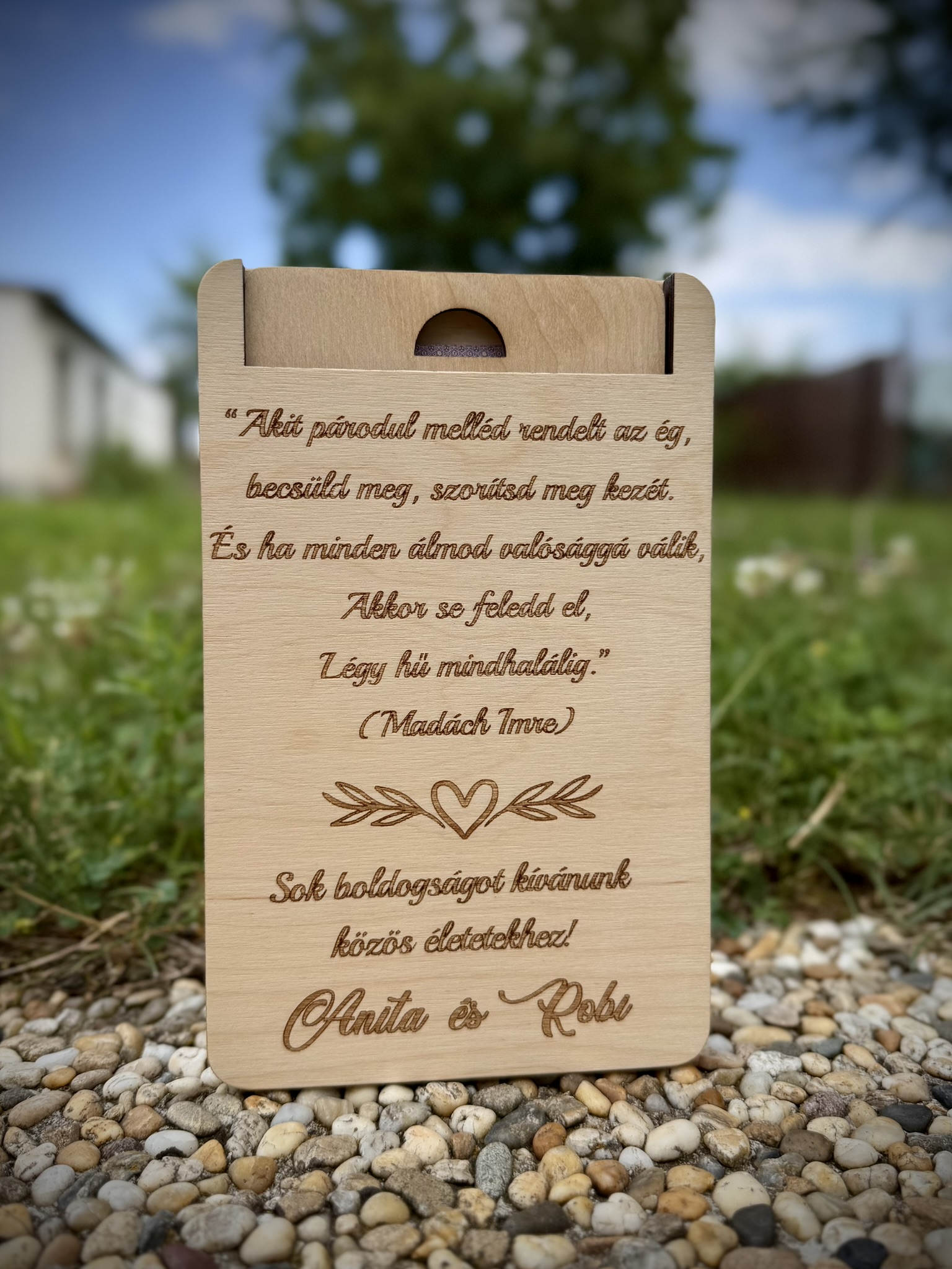 A gondosan megmunkált fa és a gravírozott részletek elegáns, természetes megjelenést adnak a terméknek, amely az esküvő után dekorációként is megőrizhető.