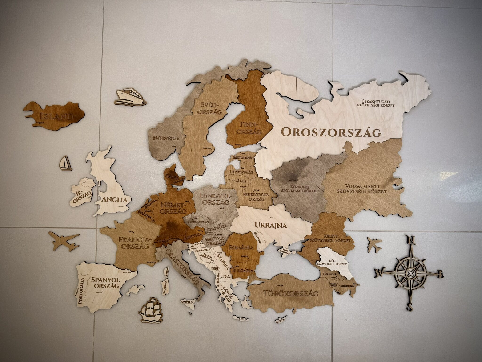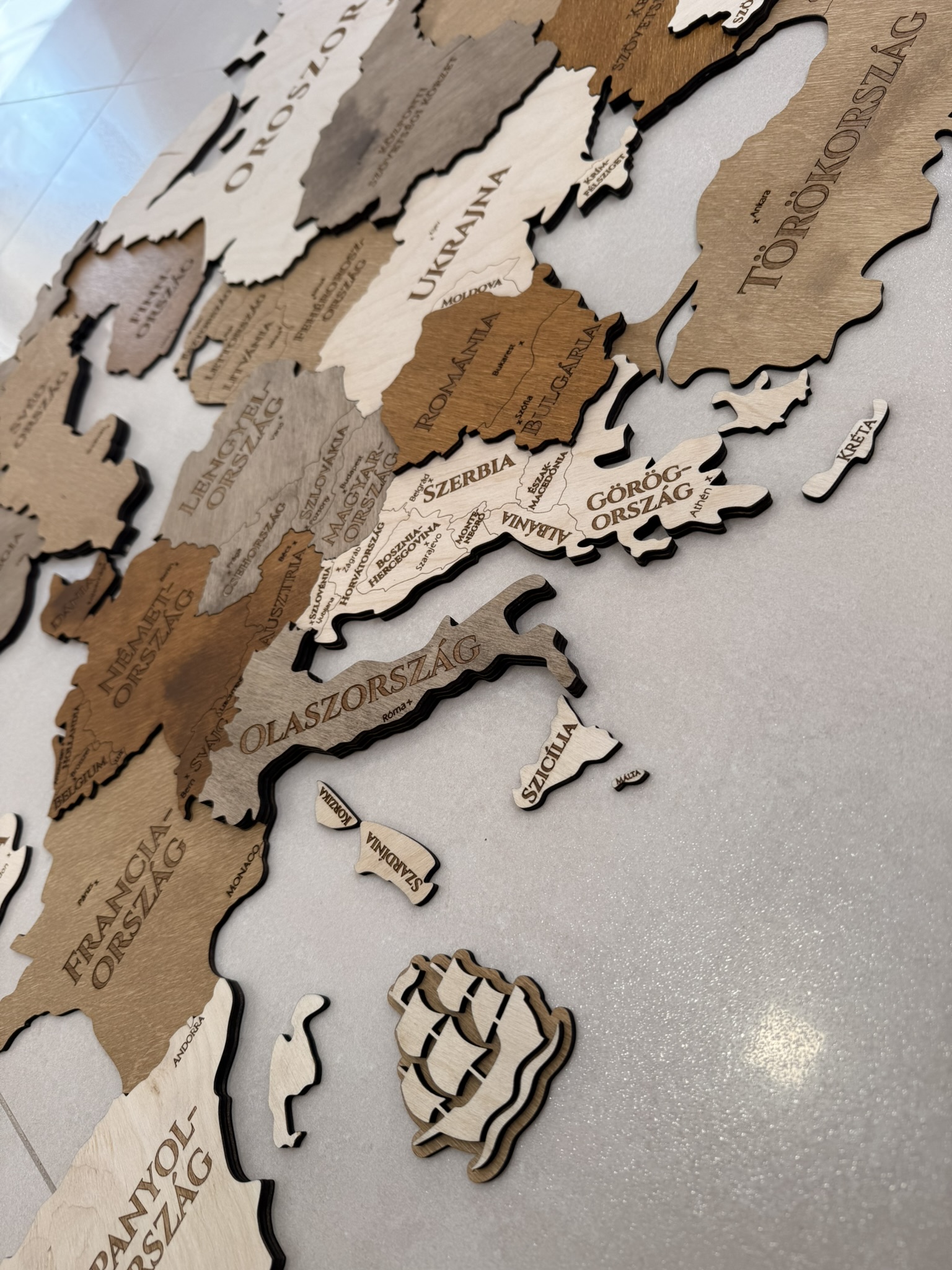 Lézergravírozott országhatárokkal, fővárosokkal és gravírozott országnevekkel. Aprólékosan kidolgozva, ügyelve a részletekre, minden darabját kézzel készítve.