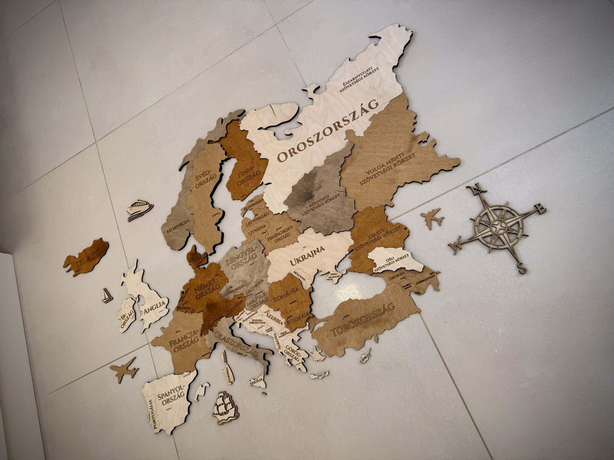 Fából készült Európa térkép, ami elegáns, időtálló dekoráció és mindig szívesen néz rá az ember.